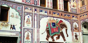 Au moment où l’Empereur Moghol Aurangzeb accède au trône en 1658, l’art de la miniature est à son plus haut degré de sophistication. Empereur cruel, il chasse de la cour les artistes et qui ensuite cherchent refuge auprès des demeures Hindous et surtout au Rajasthan. C’est alors que naît l’art de la peinture murale qui s’enrichira peu à peu en empruntant les scènes de la vie quotidienne des villageois puis plus tard l’époque coloniale, en assimilant l’influence Occidentale. Nul par ailleurs qu’au Shekawati, cette région désertique du Rajasthan, l’art n’aura si prospéré.